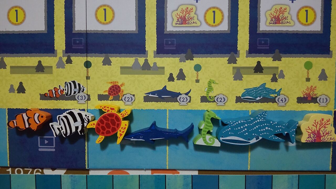 この双六の特異性はダイスを使わないことだけではありません。手番が順々に回ってこないのです。じゃあ、順番はどうなっているかというと、ゴールから1番遠い人が常に手番をするようになっています。ゴルフで旗竿から1番遠い人がプレイするのと同じようなものです。そのため、欲しい魚があったからと余りに先行してしまうと、他のオーナーにたくさん行動されてしまいます。先に取られないように気を付けつつ、行きすぎないよう自重することが求められます(下の写真の白プレイヤーは、ジンベイザメは取れましたが、他のプレイヤーに追い抜かれるまで行動が出来ません)。