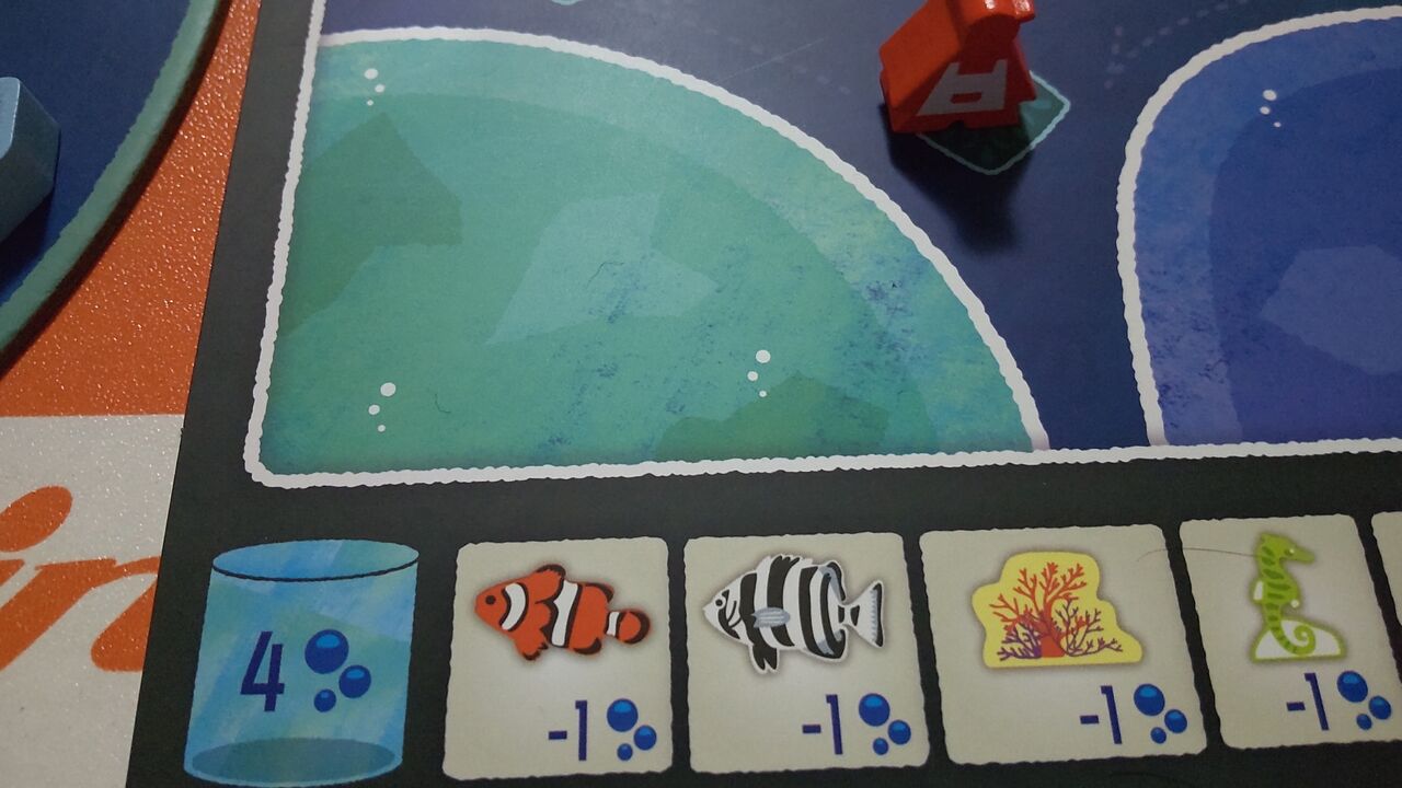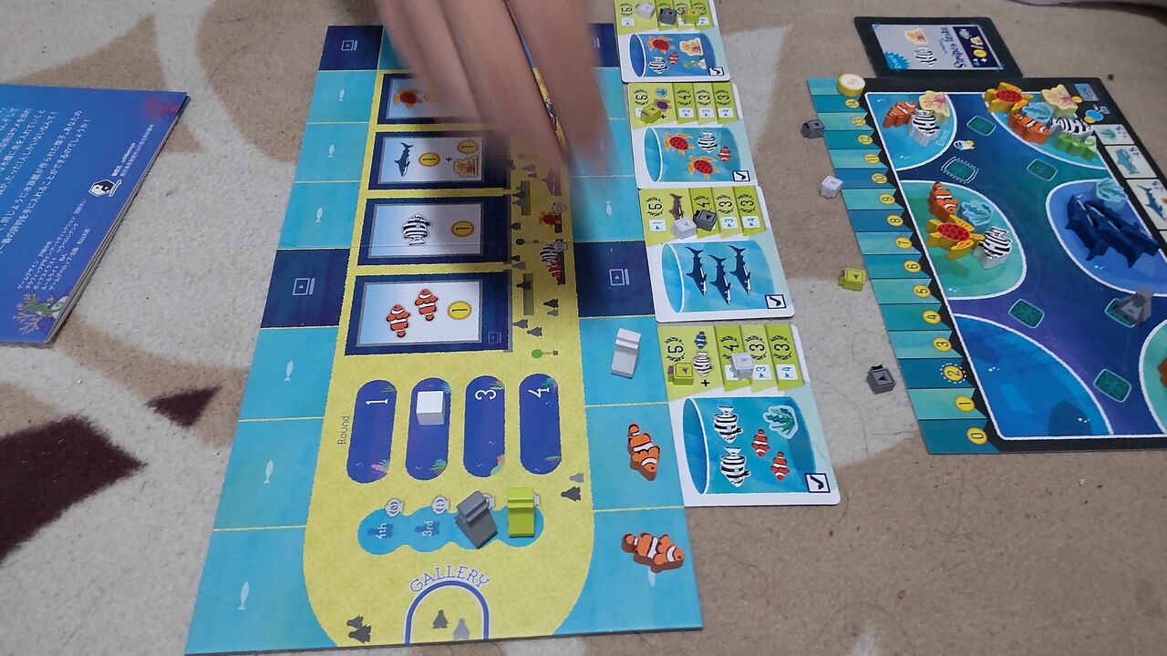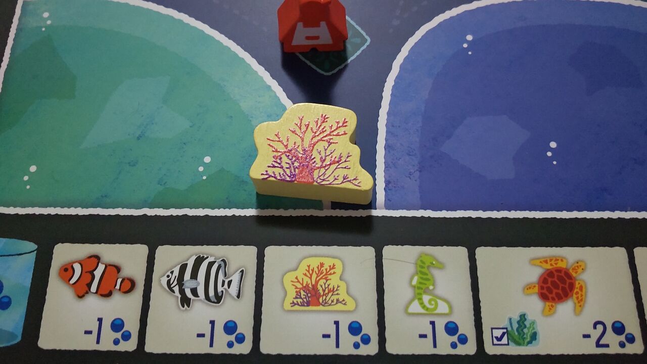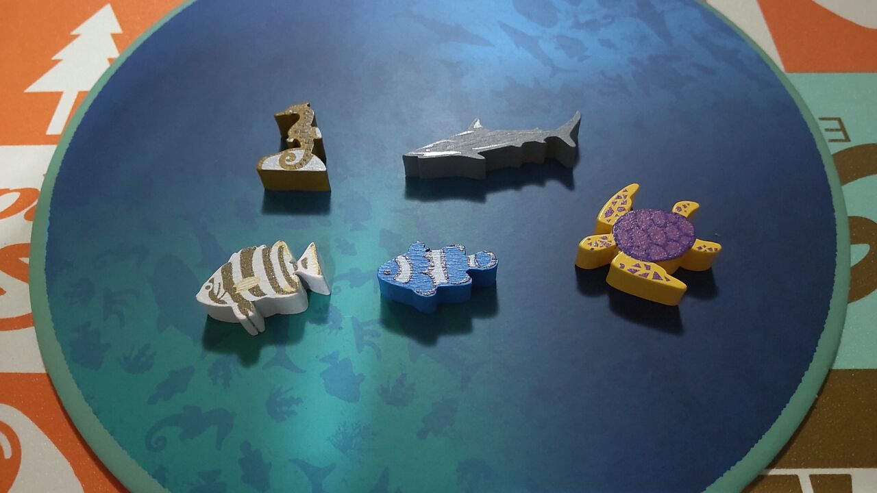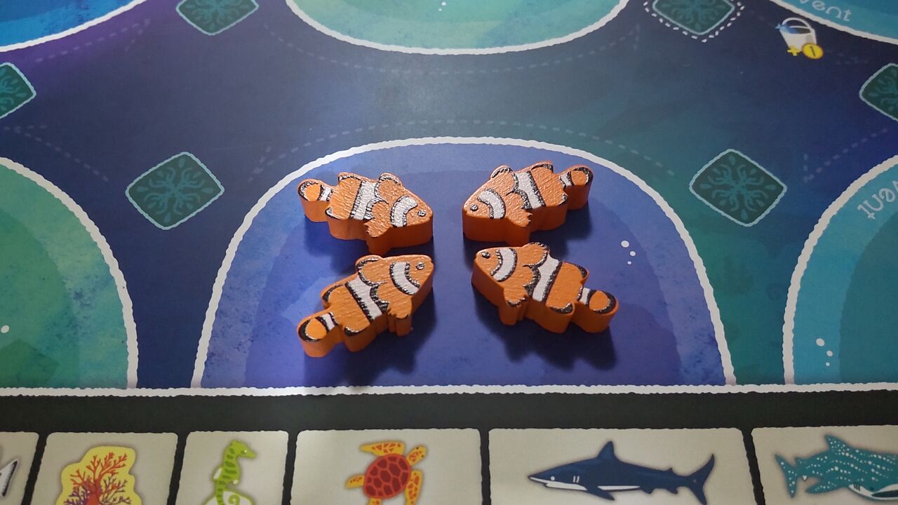 ルール的には1番後ろの人が手番というのが、今誰の手番かが分かりやすくて良いですね。我が家でプレイしていると、今誰の番だっけとなることがたまにあるのですが、このルールだとそれがありません。あと、水槽に入れられない魚駒を取ったときは海に帰せるというルールも分かりやすくて良いなと思います(ルール上は入れられないときだけでなく、いつでも好きな魚を好きなだけ海に戻せるようです。ご指摘があり追記しました)。