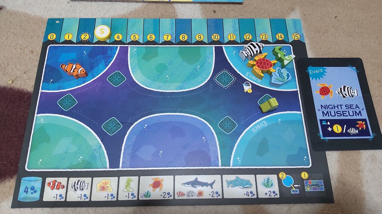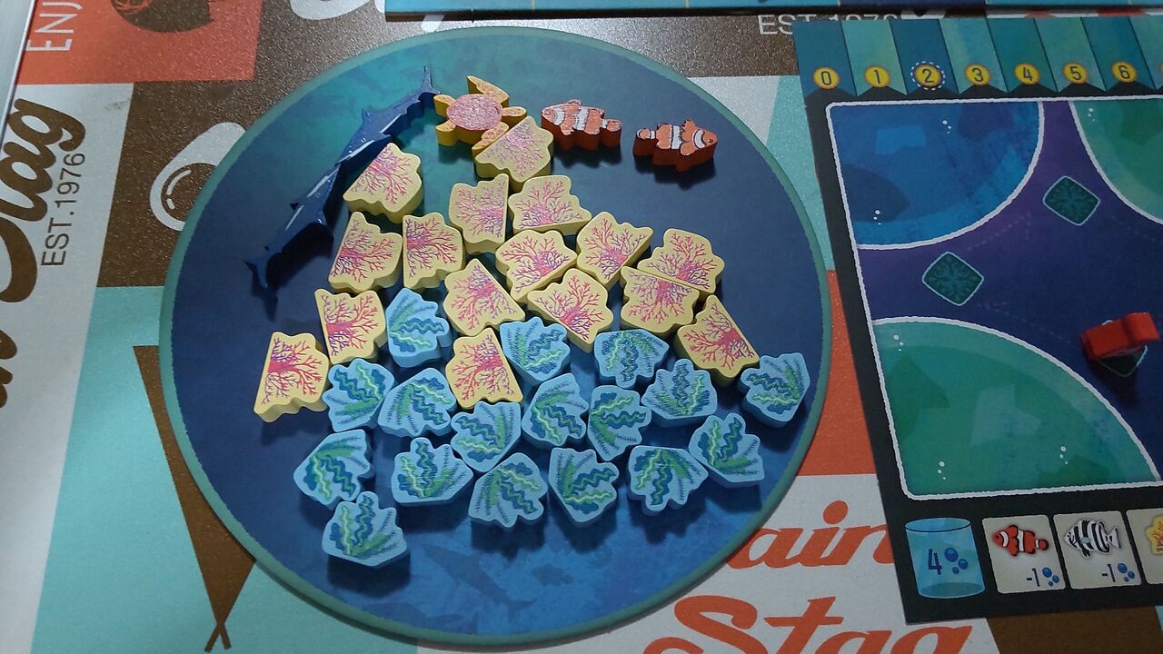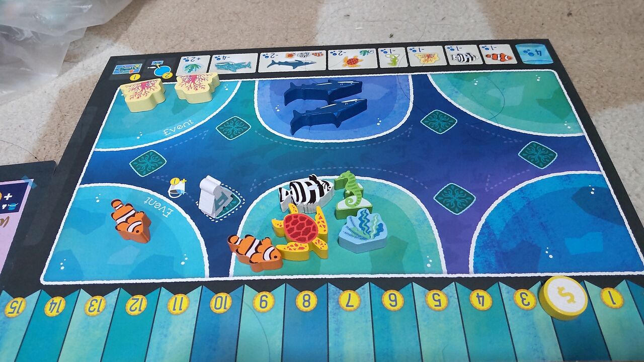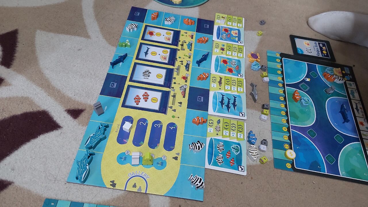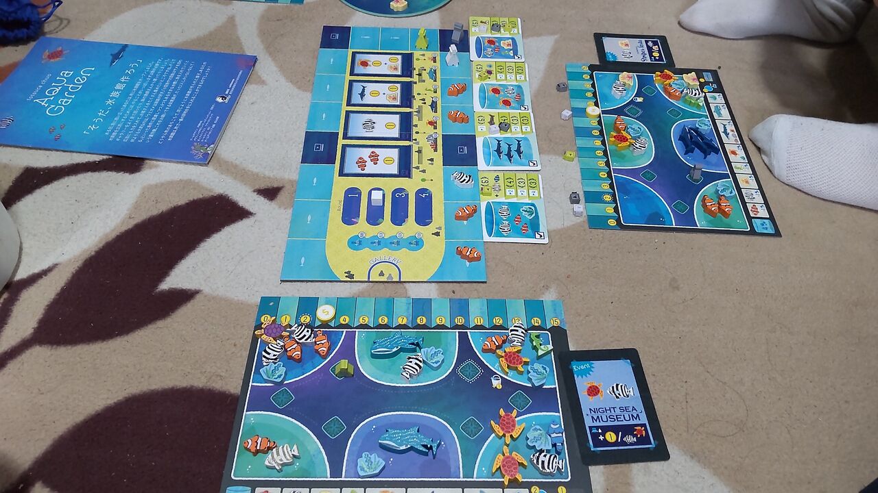 ルール的には1番後ろの人が手番というのが、今誰の手番かが分かりやすくて良いですね。我が家でプレイしていると、今誰の番だっけとなることがたまにあるのですが、このルールだとそれがありません。あと、水槽に入れられない魚駒を取ったときは海に帰せるというルールも分かりやすくて良いなと思います(ルール上は入れられないときだけでなく、いつでも好きな魚を好きなだけ海に戻せるようです。ご指摘があり追記しました)。