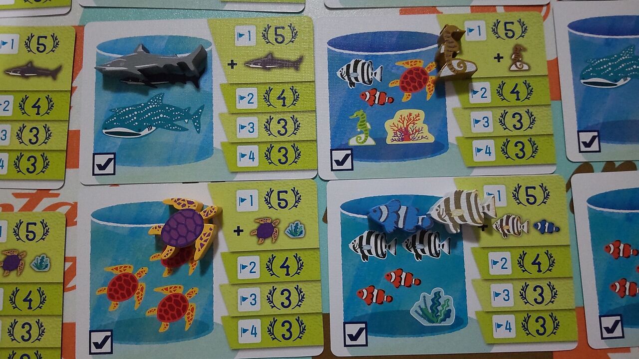 このカードに指定された魚の組み合わせで水槽を作れると、ボーナス点が貰えるのです。1番最初に作れたプレイヤーには追加ボーナスで色違いの魚駒が無料でプレゼントされます。とっても美味しいので、積極的に達成を狙っていきましょう。