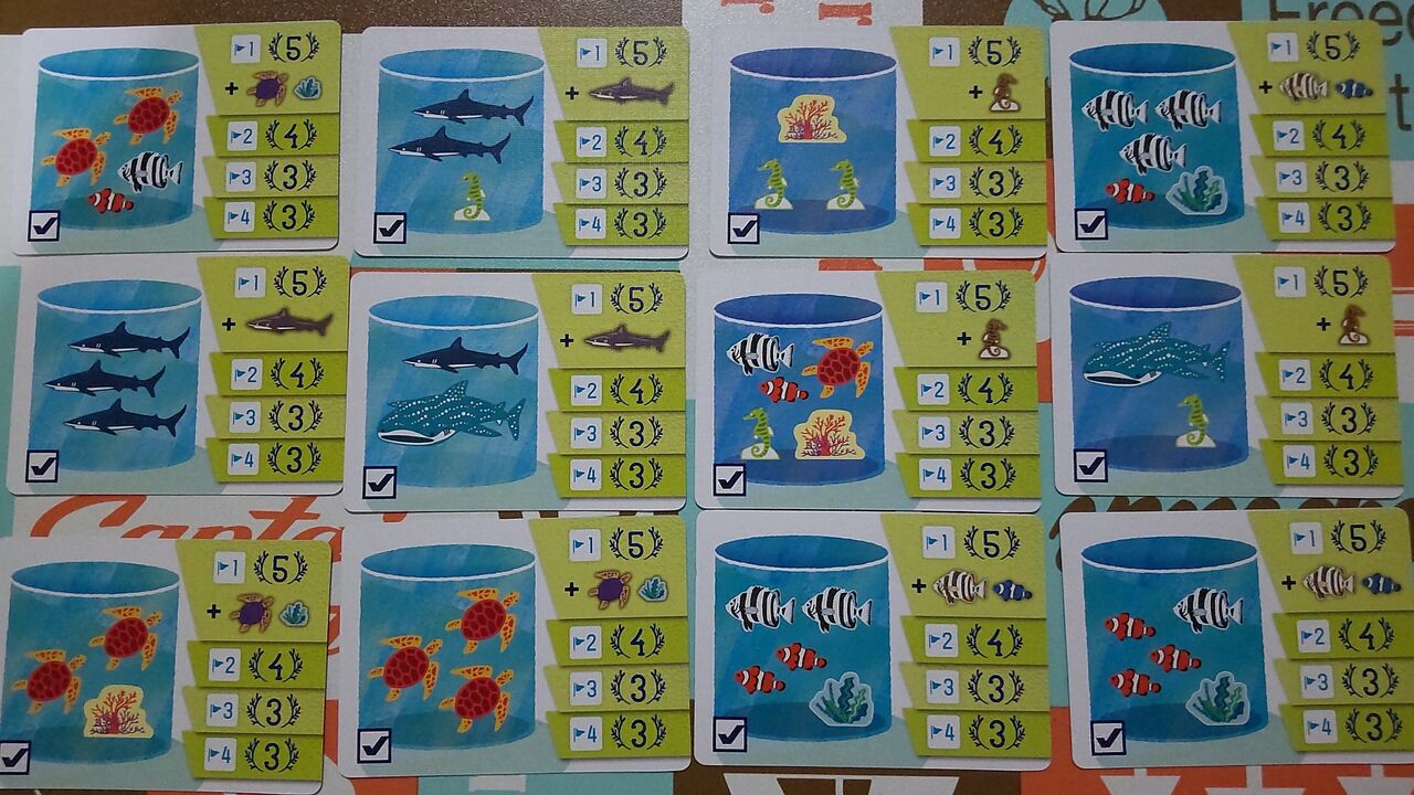 より効率的に勝利点を稼ぐ方法は、指定された組み合わせで水槽に魚を入れることです。『アクアガーデン』にはマイルストーンカードと呼ばれるお題カードがあります(全12枚、1ゲームで4枚だけ使用)。